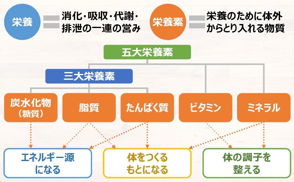 炭水化物、脂質、たんぱく質、ビタミン、ミネラルなどがあり、